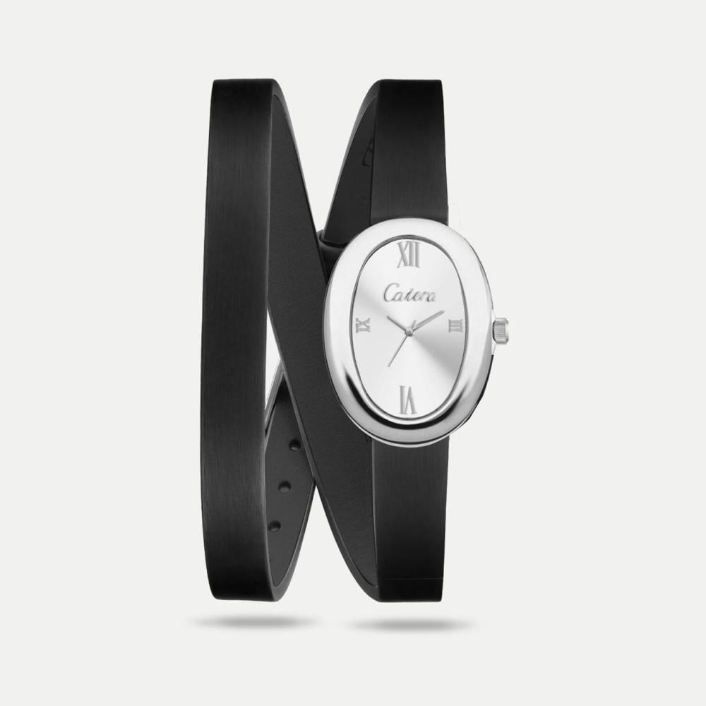 ساعة نسائية جلد ماركة كاتيرا سير أسود إطار فضي