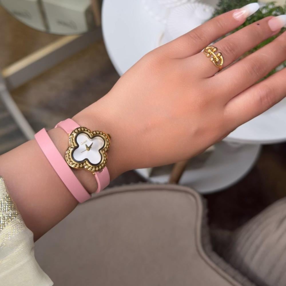 - تصميم فاخر وجذاب: إطار ذهبي أنيق مع سير جلد ناعم باللون الوردي.